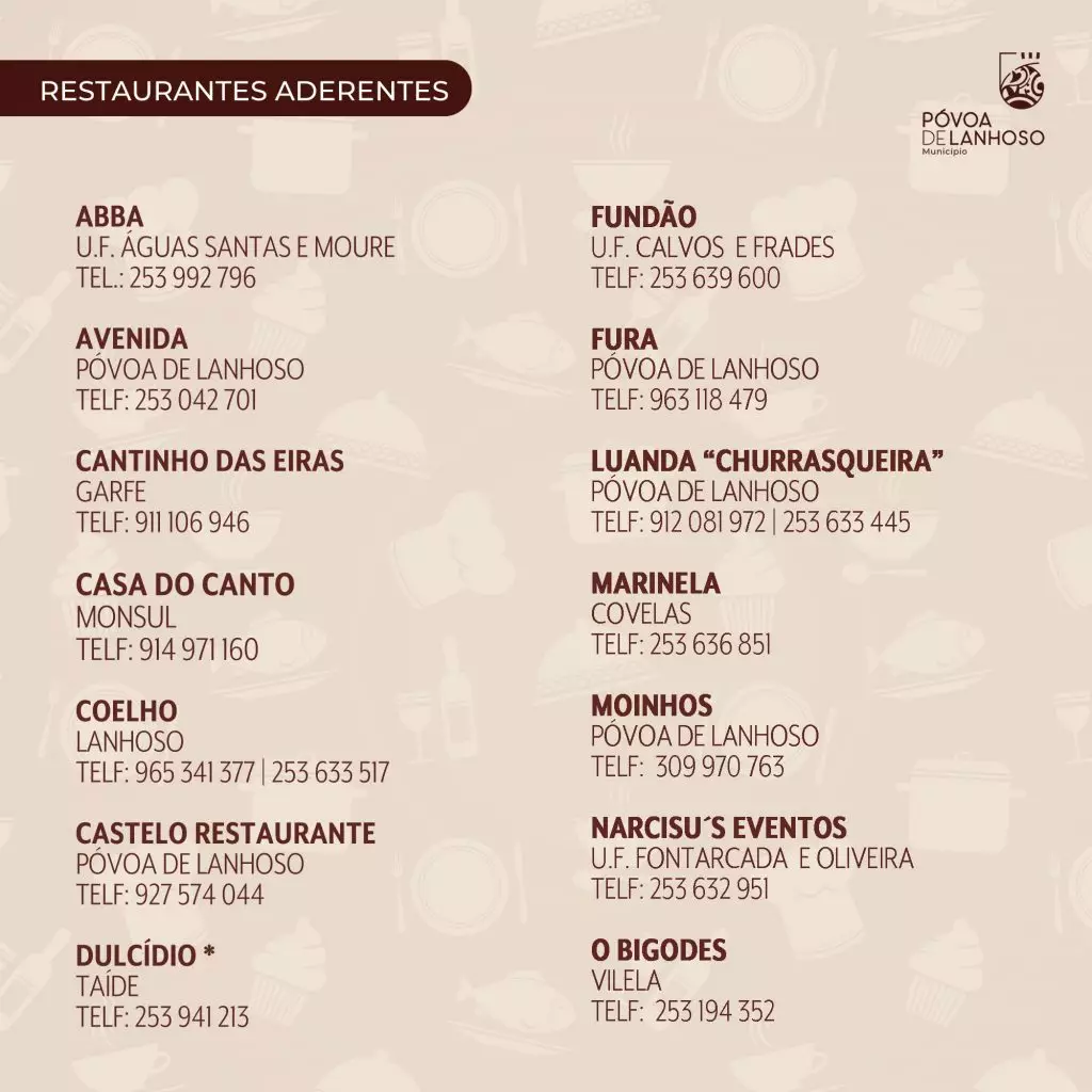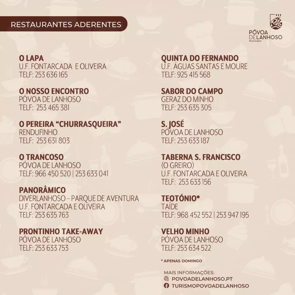 A iniciativa “Sente-se à Mesa com a Gente” envolve, este ano 27 restaurantes povoenses que aceitaram o desafio e deste modo, estão também agendados para 24 e 25 de Maio o Sr. Bacalhau; para 5, 6 e 7 de Setembro o Bife à Romaria; para 18 e 19 de Outubro o Pica no Chão e, para finalizar, nos dias 22 e 23 de Novembro será a vez das Papas de Sarrabulho e Rojões.